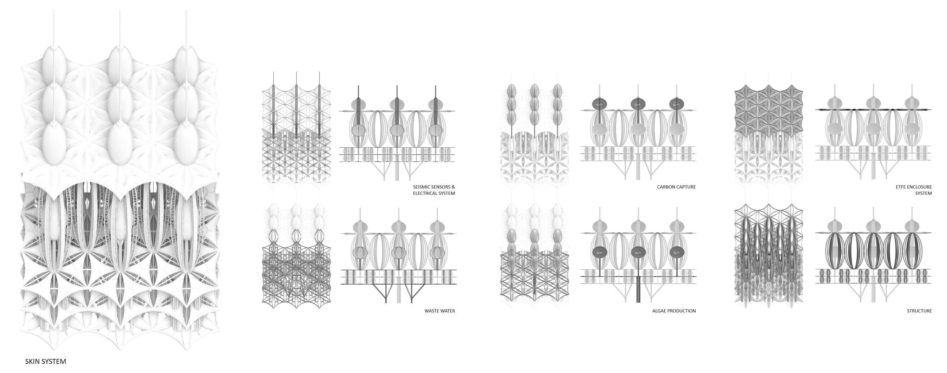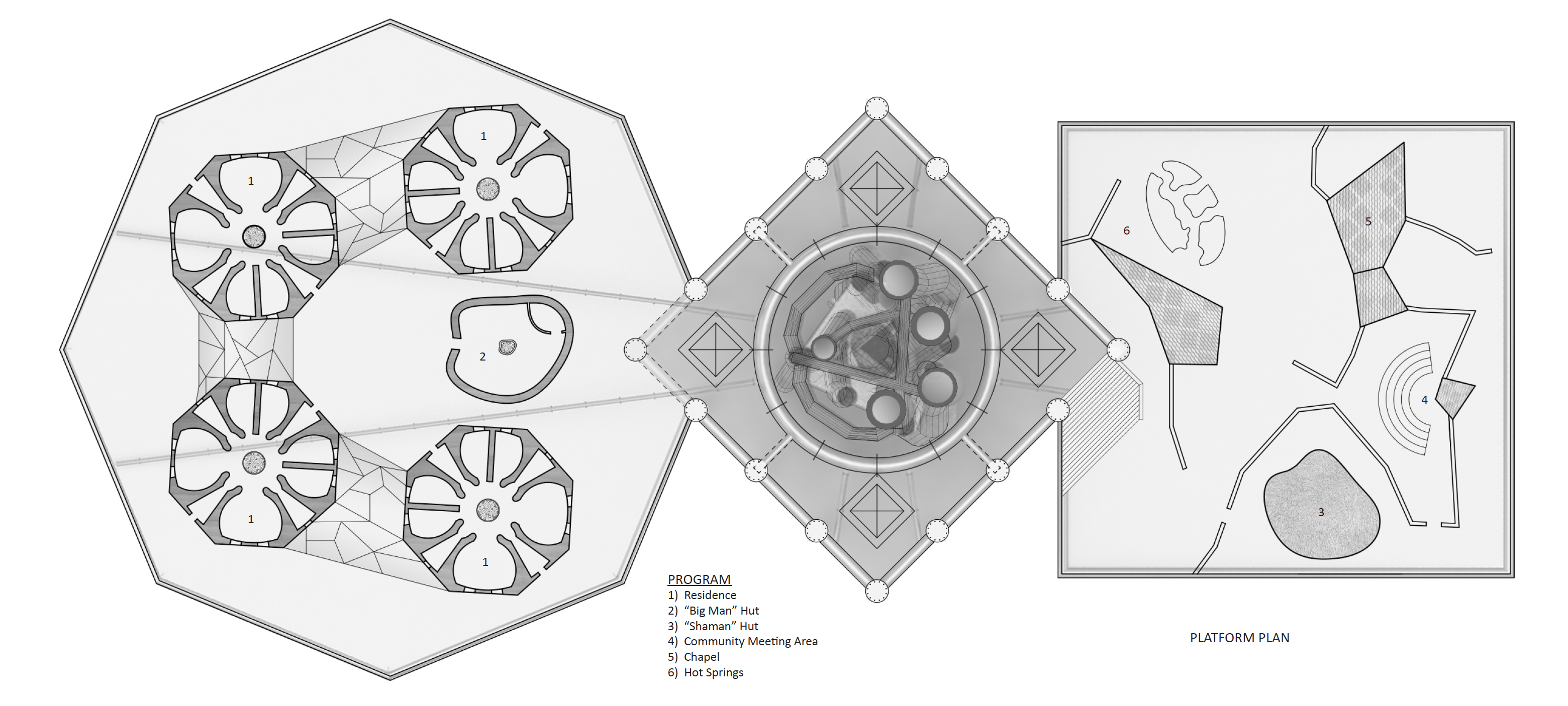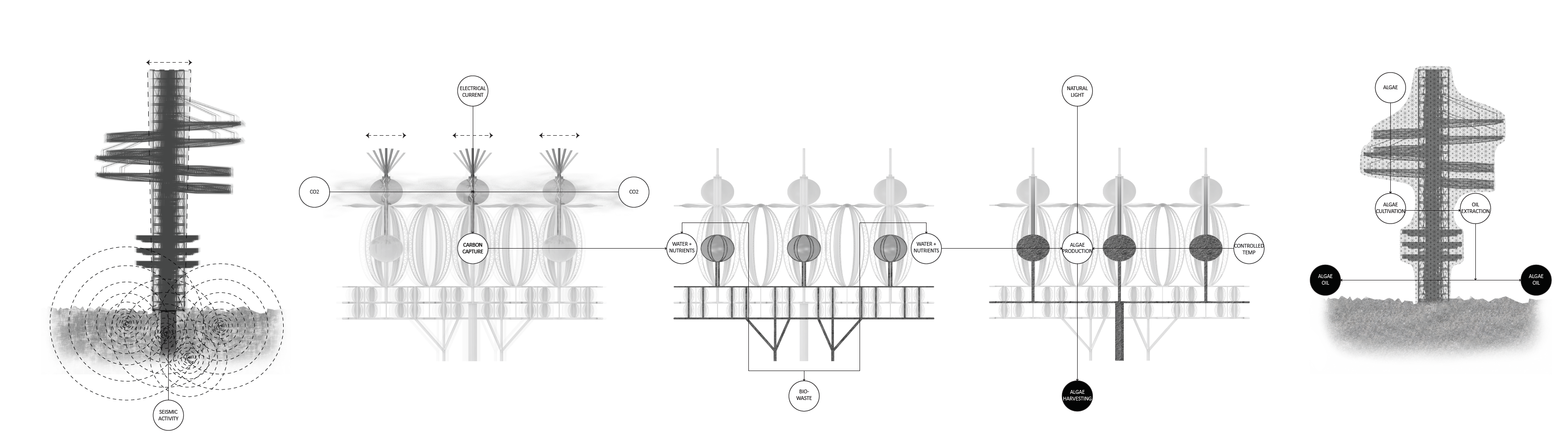 South-Eastern Ohio has been over-fracked and the land is experiencing constant seismic activity as well as the release of harmful gases. While the area is no longer safe to live on, elevated communities have been developed around towers built upon old fracking wells. These communities (of around 100 people each) are inhabited by people willing to withstand the harmful conditions and give up living on the ground in order to help restore the land condition. Due to the geothermal energy collected from the old fracking wells, these communities produce more energy than they consume. In addition the community focuses on sequestering carbon through the use of algae reservoirs and pumping the carbon back down the tower into the earth. These communities are self-sufficient with members working within the community to keep it running.