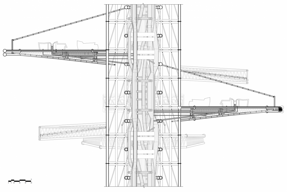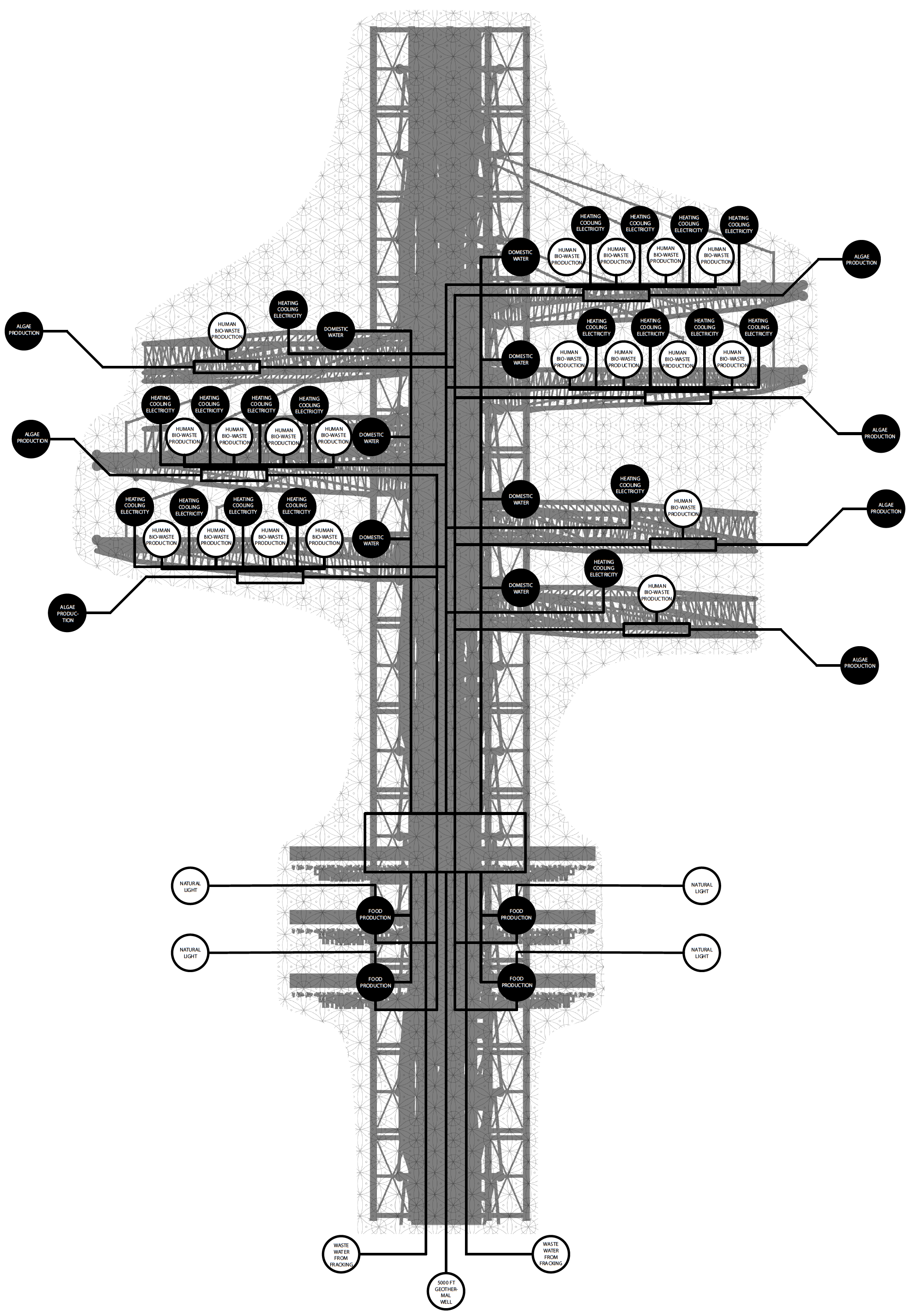 The tower is organized into four series of interconnected communities consisting of a residential platform, circulation space, and community area. These connected communities are rotated 90 degrees around the tower, ensuring equal sunlight to each village.